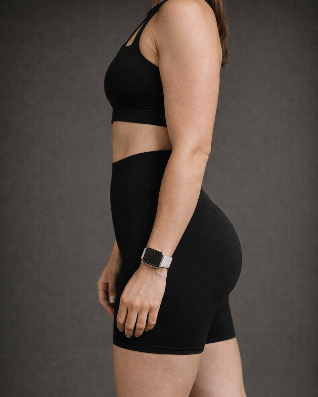Woman wearing a black sports bra and shorts set on a gray background